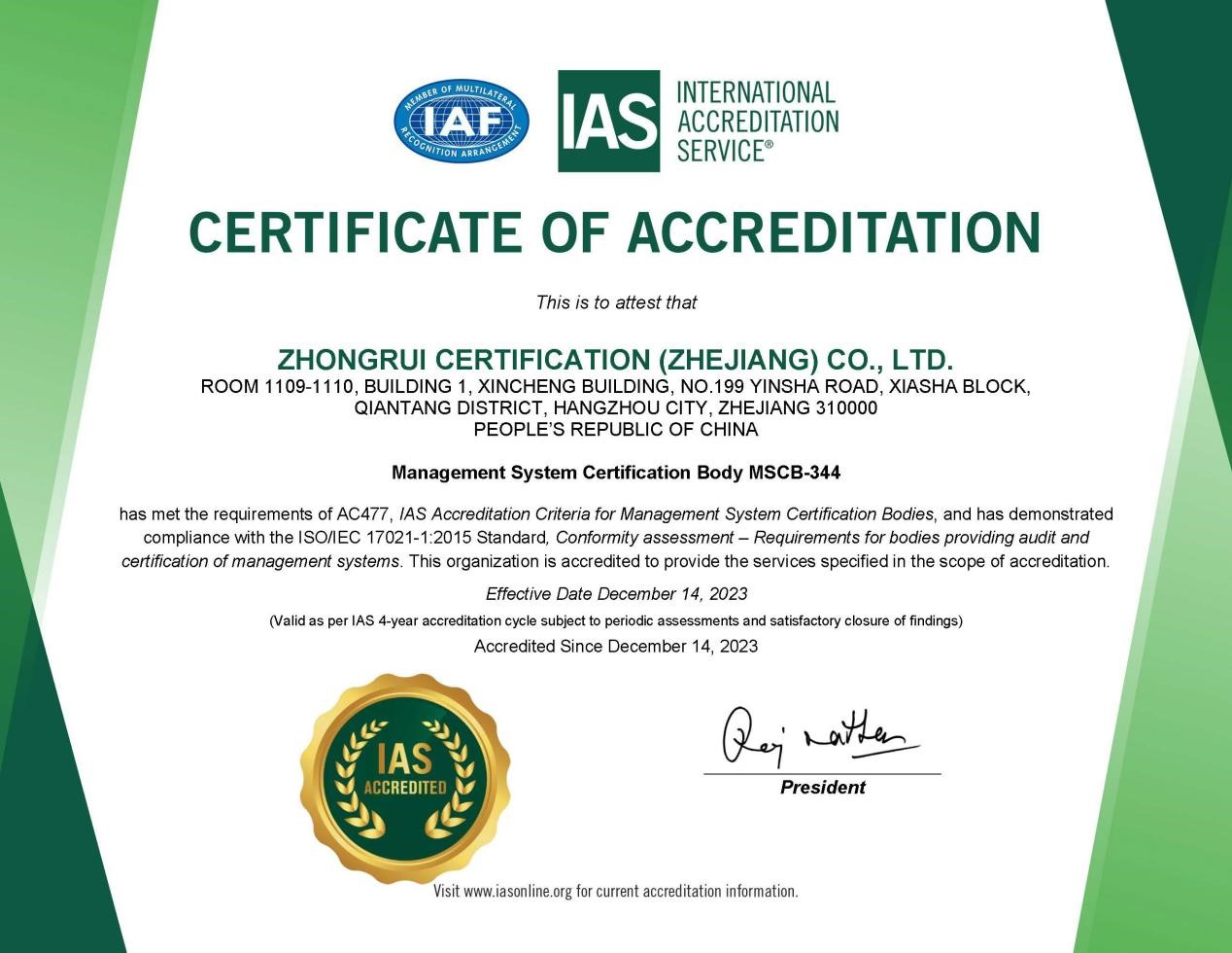 2023年12月14日,我機構(gòu)順利通過了美國權(quán)威認可機構(gòu)IAS的質(zhì)量管理體系、環(huán)境管理體系、職業(yè)健康安全管理體系的評審,獲頒發(fā)認證機構(gòu)認可證書(證書編號:MSCB-344),并準予在以上獲準認可的領(lǐng)域范圍內(nèi)宣傳認可狀態(tài)、使用IAS標(biāo)識和IAF國際認可標(biāo)識。